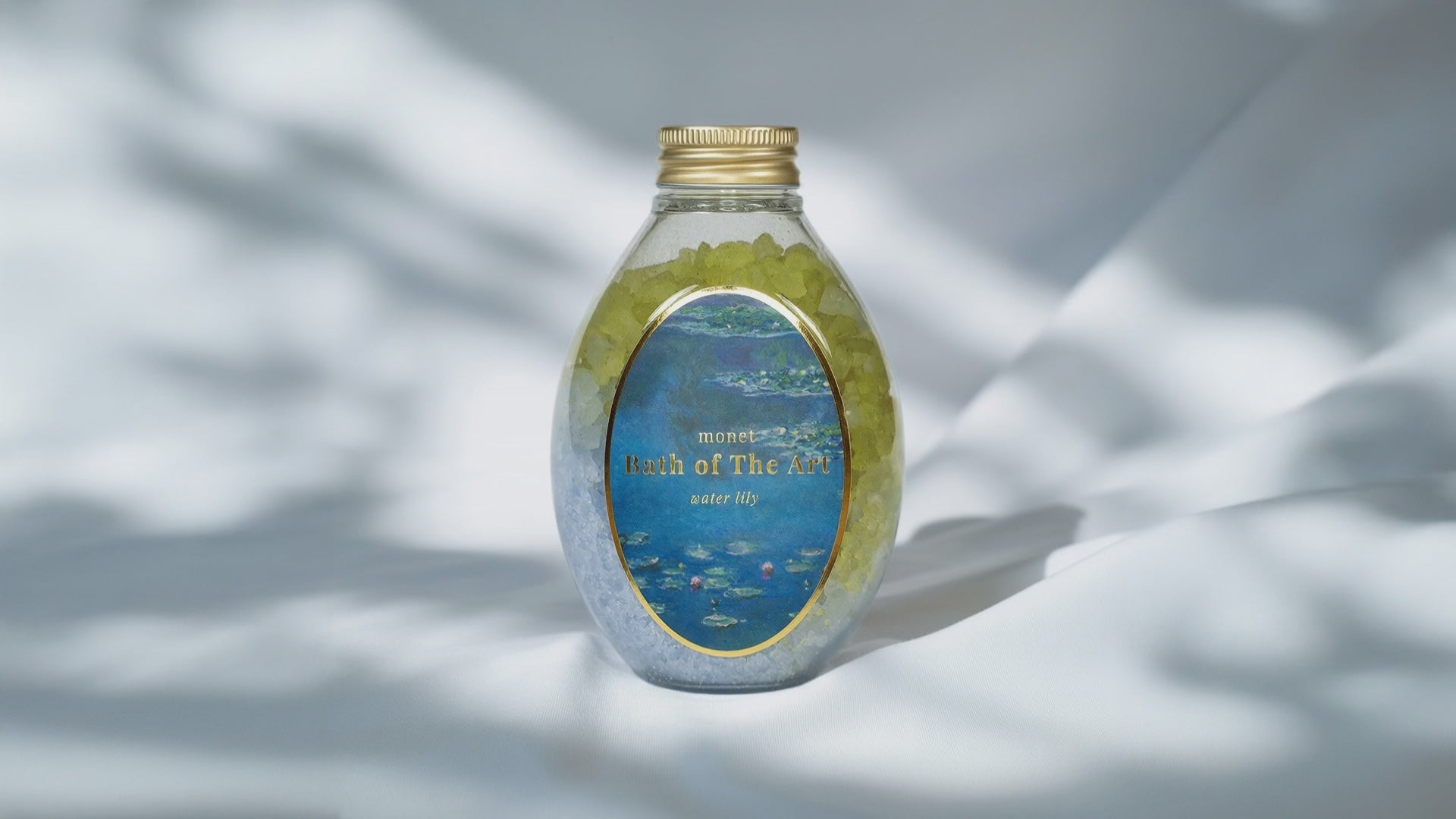 印象派の巨匠クロード・モネの睡蓮をイメージした、鮮やかなグリーンとブルーのバスソルト。
